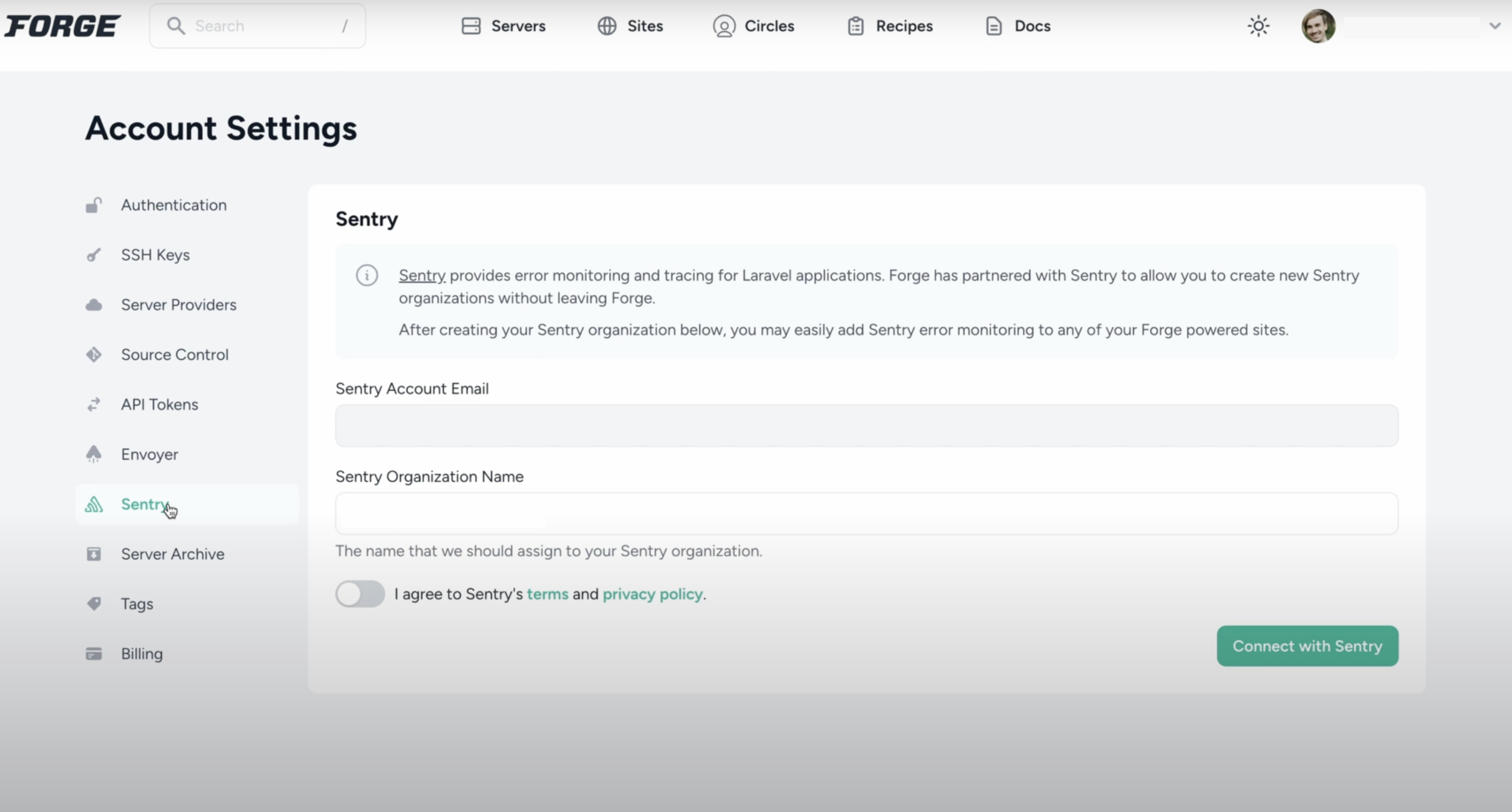 If you're using Laravel's Forge platform to provision and deploy your PHP application, you can create a Sentry organization through Forge.