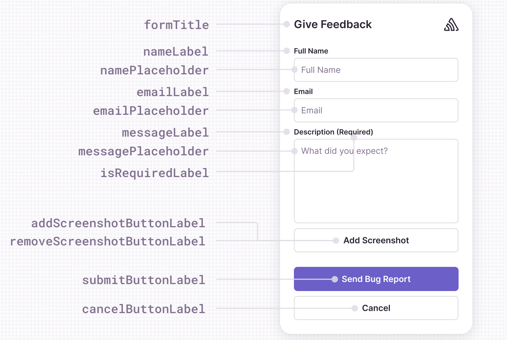 submitButtonLabel | "Send Bug Report" | The label of the submit button used in the feedback widget. |