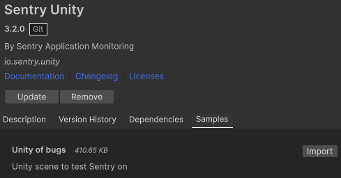 Additionally, the packages includes a sample called "Unity of bugs" that can optionally be imported into your project through the package manager. The samples contain a variety of common bugs, including native errors, so you don't have to write them.