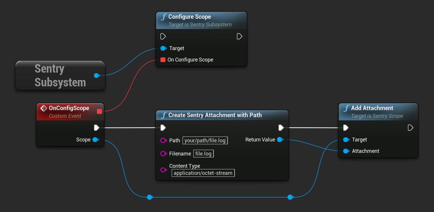 The same result can be achieved by calling the CreateSentryAttachmentWithPath function in blueprint.