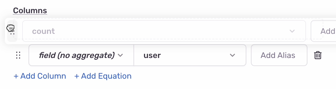 By default, the first column is already configured for you, but you can update it. To add more columns, which stacks events, add functions (f(x)) that can take in parameters. Field and tag columns will help you view more details about the events (for example, title to see the description of an issue or users to see how many users it's affecting).