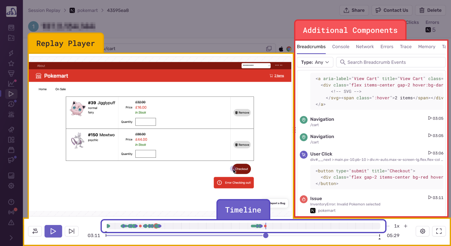 - Breadcrumbs: The replay breadcrumbs show when key user interactions took place, specifically: user clicks (including rage and dead clicks), user inputs, page navigations, page loads, as well as custom breadcrumbs set by the organization and Web Vitals. Web Vitals are augmented with the selector to help users identify which elements are affecting their Web Vital scores. User clicks (including rage and dead clicks), are augmented with surrounding HTML source code to help users understand which event was targeted. These breadcrumbs are synced with the replay player and will auto-scroll as the video plays.