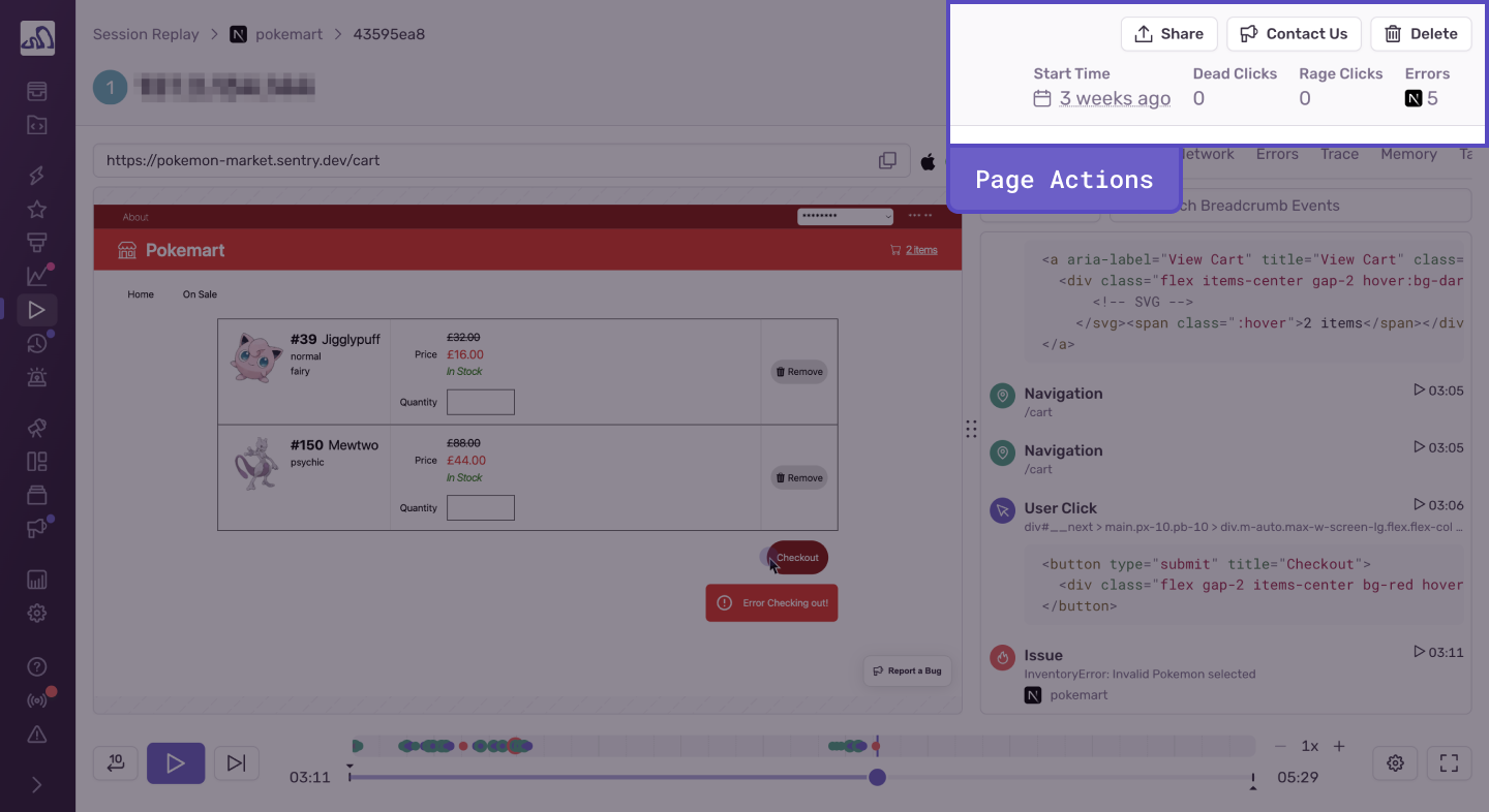 Errors: See all the errors that occurred in the replay, with links to the corresponding events and issue(s), and the impact these issues have had holistically across all users on your application.