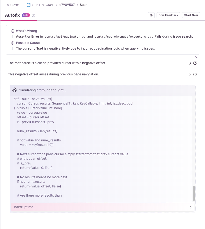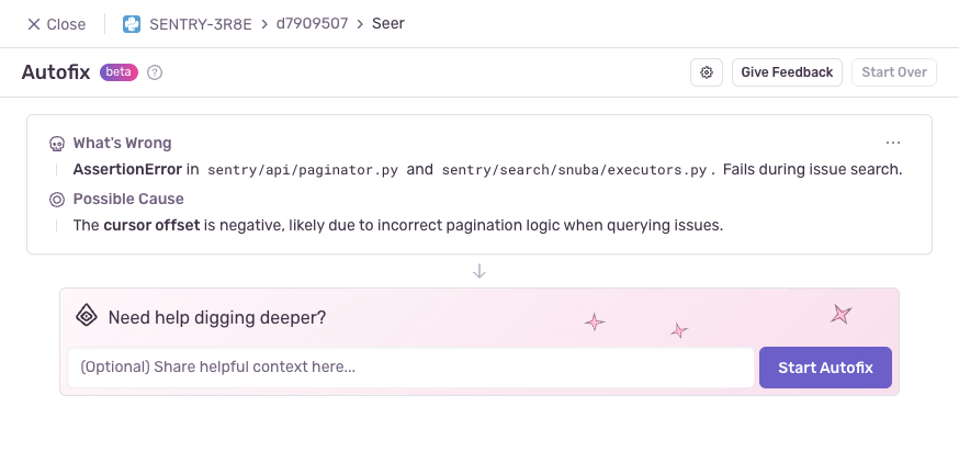 While Autofix is reasoning through your problem, you can step in at any time to add context or feedback; collaboration tends to lead to the best results. If Autofix encounters gaps in its understanding, it will ask for your input.