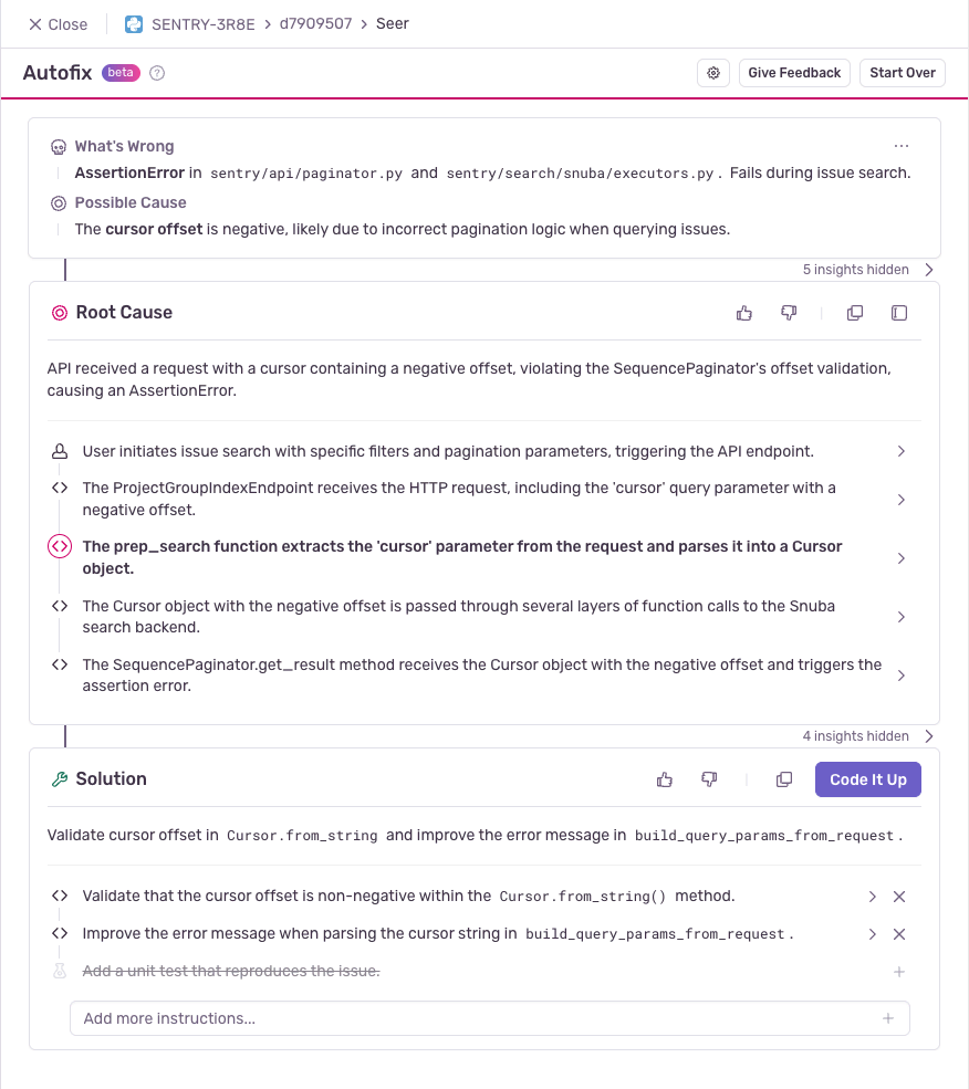 Autofix will then analyze the issue and relevant code to help identify the root cause and a solution. You'll see a live stream of Autofix's thought process in real time as it works through the problem. Autofix will share key insights as they come up and you'll have the option to expand each. You'll see the event data and code that support Autofix conclusions, building a clear chain of reasoning back to the root cause.